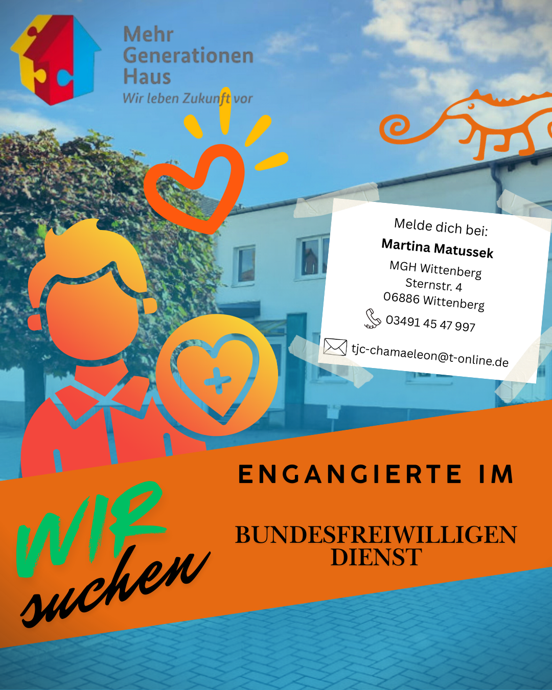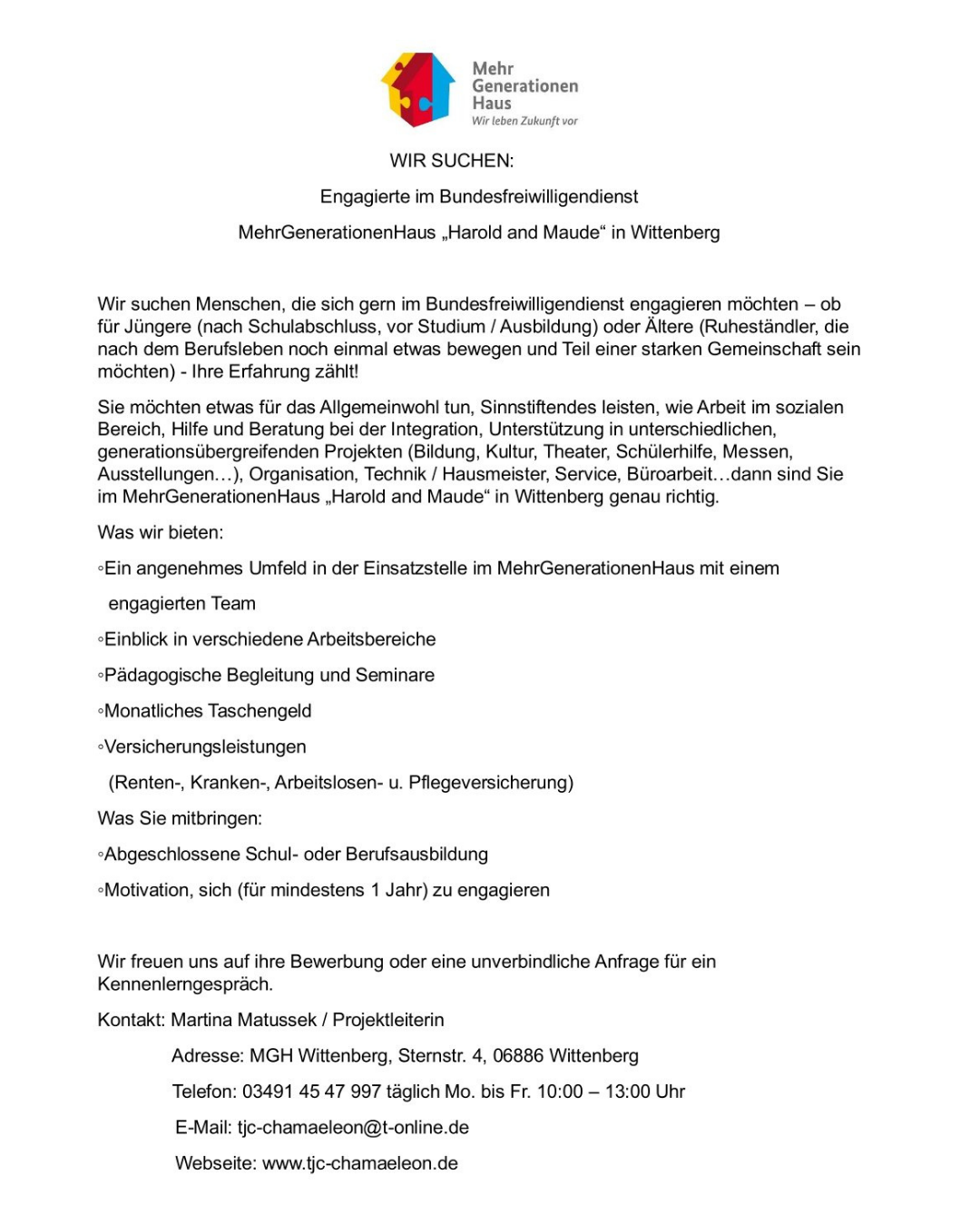 Sie möchten etwas für das Allgemeinwohl tun, Sinnstiftendes leisten, wie Arbeit im sozialen Bereich, Hilfe und Beratung bei der Integration, Unterstützung in unterschiedlichen, generationsübergreifenden Projekten (Bildung, Kultur, Theater, Schülerhilfe, Messen, Ausstellungen…), Organisation, Technik / Hausmeister, Service, Büroarbeit…dann sind Sie im MehrGenerationenHaus „Harold and Maude“ in Wittenberg genau richtig.